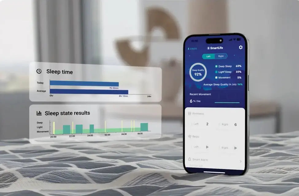 Each of you can easily select your ideal comfort setting — from firm to soft — on your own side of the mattress. This means no more compromising on your sleep quality. The SmartLife mattress adapts to you, providing a personalized sleep experience that leaves both you and your partner well-rested and rejuvenated every morning.